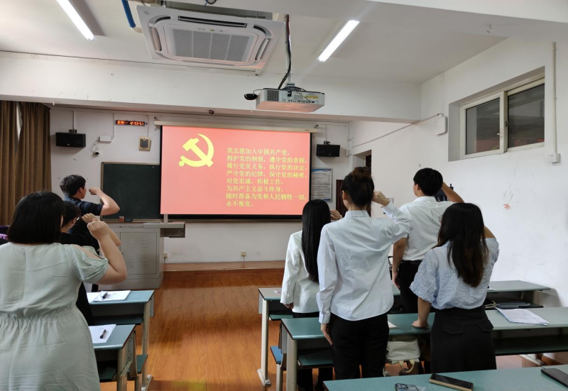 经过支部大会不记名投票表决,全票通过李浩明等4名同志发展为中共预备党员,随后,参会的党员教师为新入党的同志佩戴党徽并进行入党宣誓。